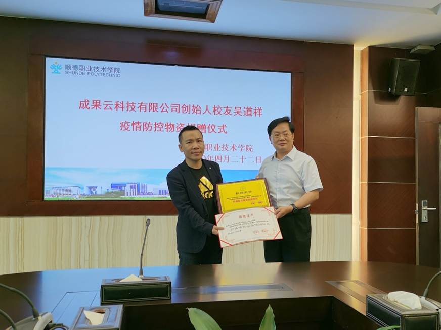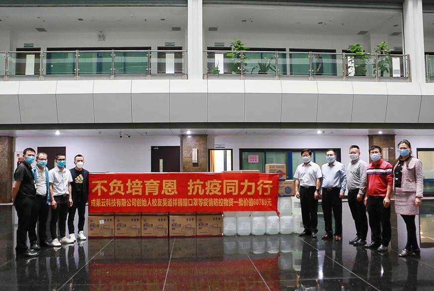 2020年4月22日,成果云科技有限公司创始人、校友吴道祥疫情防控物资捐赠仪式在学校行政楼举行。成果云(广东)科技有限公司创始人、taptap校友吴道祥,创业团队核心成员、校友张庆全、黄颖,学校校长夏伟、校友会基金会负责人、校党政办、党委宣传部、信息中心、顺大公司、后勤保卫处、资产设备处等相关人员参加活动。