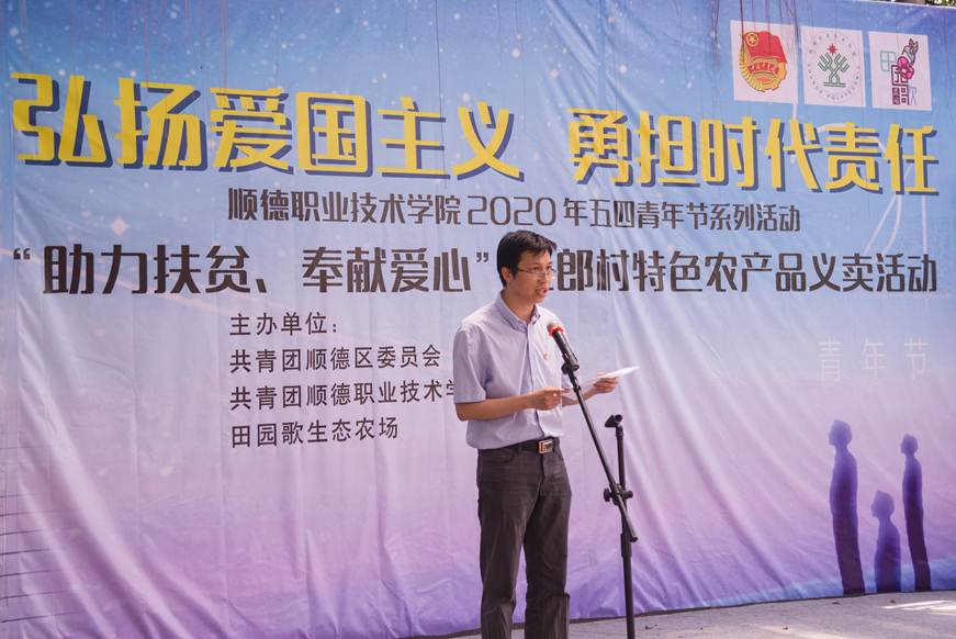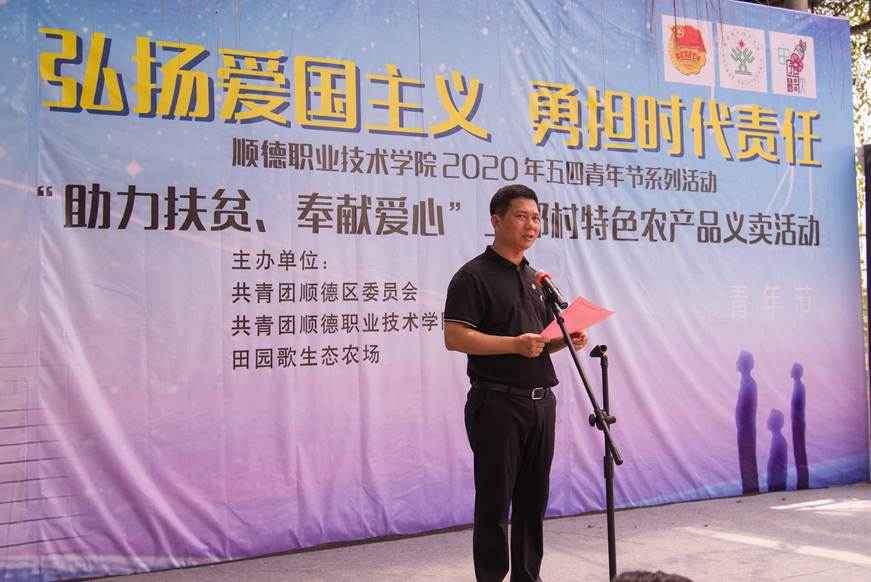 taptap团委书记王晓致辞。他首先对指导和支持本次活动的共青团顺德区委员会、学校党政主要领导、佛山市顺德区田园歌农林有限公司的大力支持表示感谢。他说,历年来,在学校党委领导下,taptap扎实推进脱贫攻坚工作,帮扶对口扶贫地区经济建设发展,前后选派了龚东超等一批扶贫干部驻守对口扶贫村,在教育扶贫、生态扶贫、产业扶贫等方面取得了一定成效,得到了当地政府和村民的一致好评,多次荣获省、市级“扶贫工作先进单位”等荣誉称号。近期,校团委还组织了一批青年师生到雷州市北和镇新家村开展义务植树活动,助力新家村“绿色家园”建设;值此五四青年节,希望通过本次“助力扶贫,奉献爱心”义卖活动,充分发挥青年生力军的先锋模范作用。