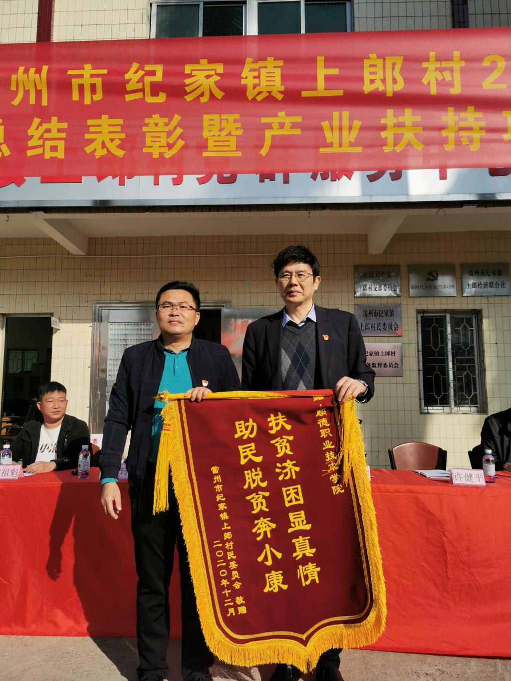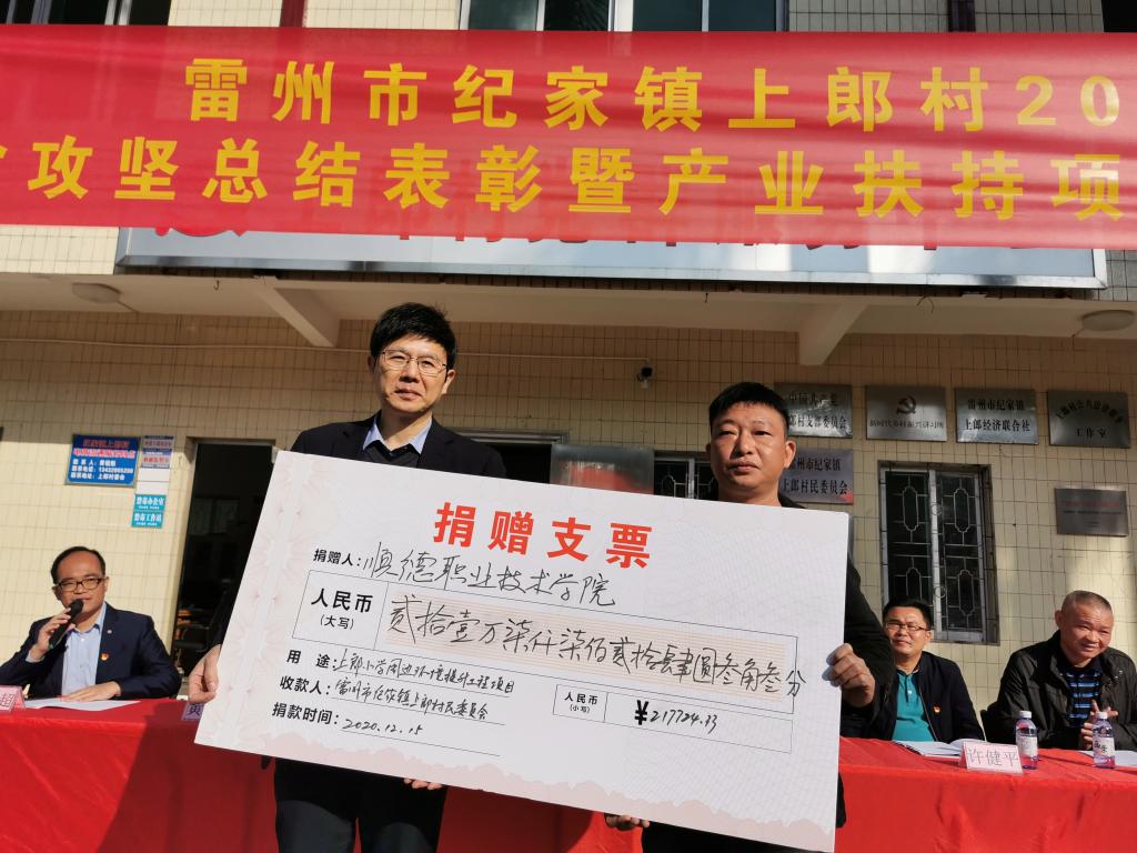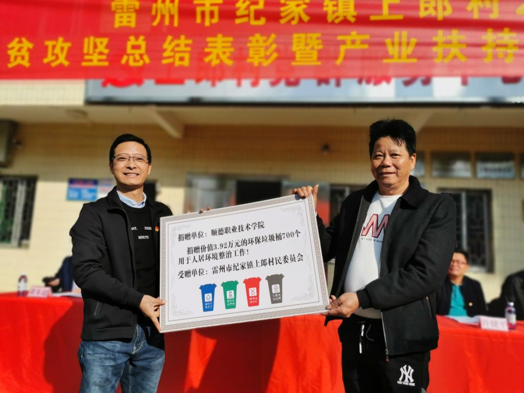 会上,学校分别向上郎村捐赠21.77万元以及700个环保垃圾桶用于上郎村扶贫项目建设和人居环境整治工作,并接受上郎村村委会感谢锦旗。