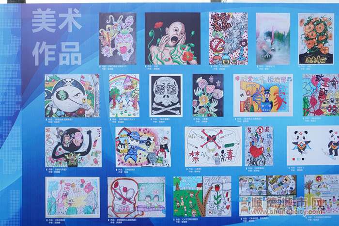 活动现场,在学校的主要干道和场馆内,按照美术、摄影、文学、书法等不同形式和类别共展出了1000余份禁毒文艺作品,吸引了大批学生驻足参观。这些展品整体展出时间约为一周,在这期间,同学们可自行参观,感受由文艺作品传达出来的禁毒正能量!