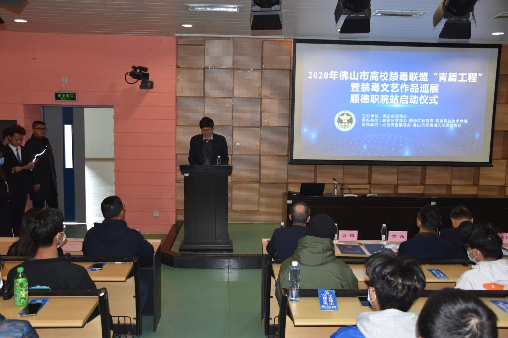 佛山市禁毒办专职副主任梁敦挺致辞。他指出,开展禁毒教育进校园具有重要意义,并结合佛山市禁毒工作实际情况,阐释了“青盾工程”工作方案的具体内容。他希望通过本次禁毒巡展活动,引导师生秉承健康人生、绿色无毒的观念,发掘培养一批具有主观意愿和参与能力的师生,作为组织开展高校禁毒宣传工作的有生力量。