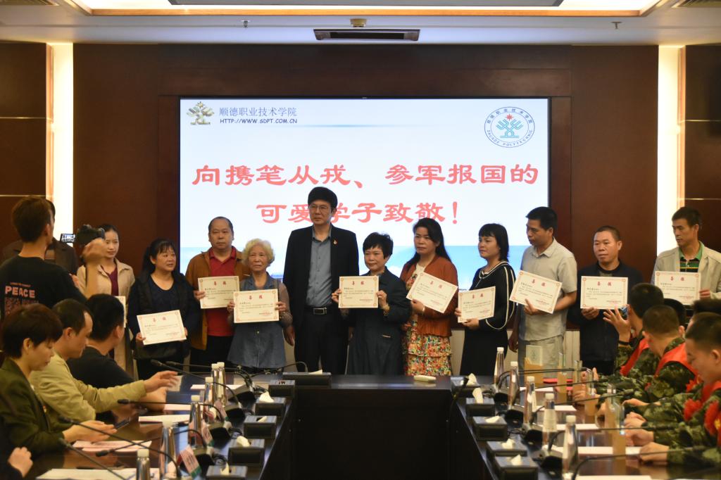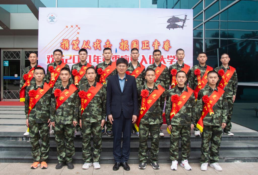 3月13日上午,taptap在行政楼1117会议室为2021年春季征兵体检、政审双合格的80名大学生举办欢送仪式。学校党委书记李先祥、学生工作部(武装部)、医药卫生学院、烹饪学院相关负责人,林镇豪等15名新兵代表及其家长代表参加了本次欢送仪式。