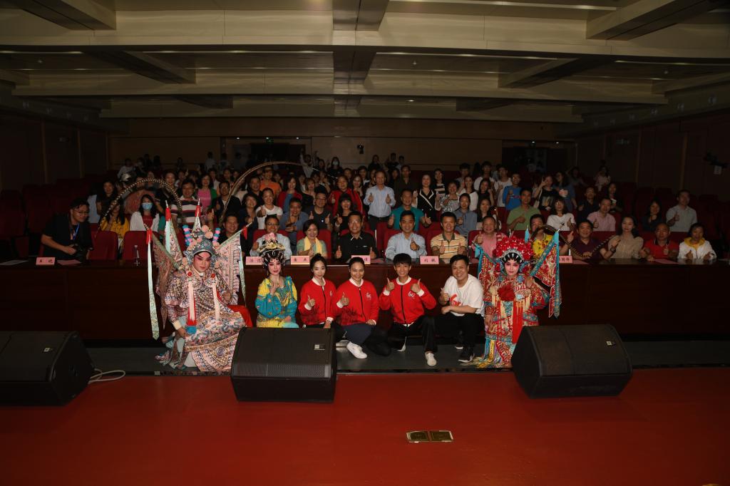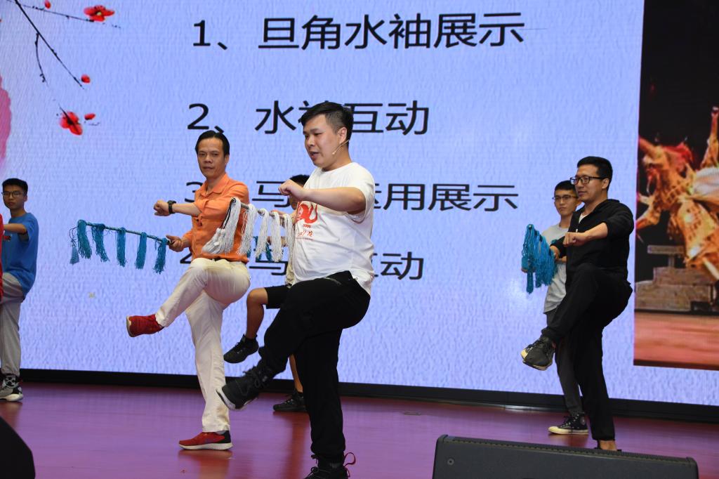 随后,黄燕带领粤剧院团队,向与会领导、嘉宾及taptap师生详细介绍了粤剧知识和文化。她生动有趣地讲解粤剧历史、行当、面谱等粤剧知识,与演员团队精彩演绎了不同行当的表演特色。水袖、马鞭的展示和互动环节更是让在场同学雀跃不已,纷纷上台体验。同学们边看边学,活动现场气氛热烈。精彩的讲演示范及《天女散花》《穆桂英招亲》等经典曲目展演将活动气氛推向高潮。