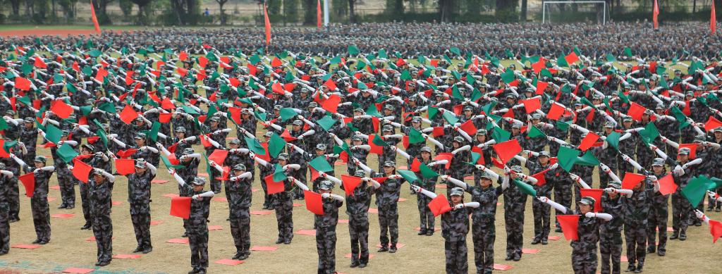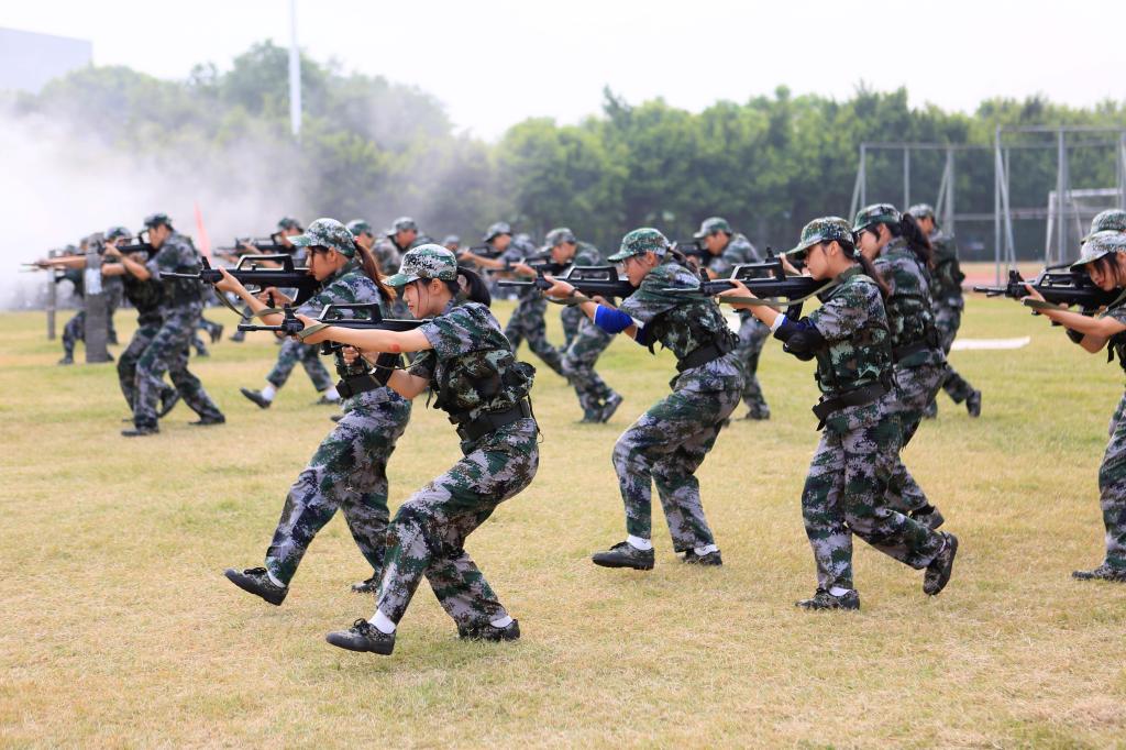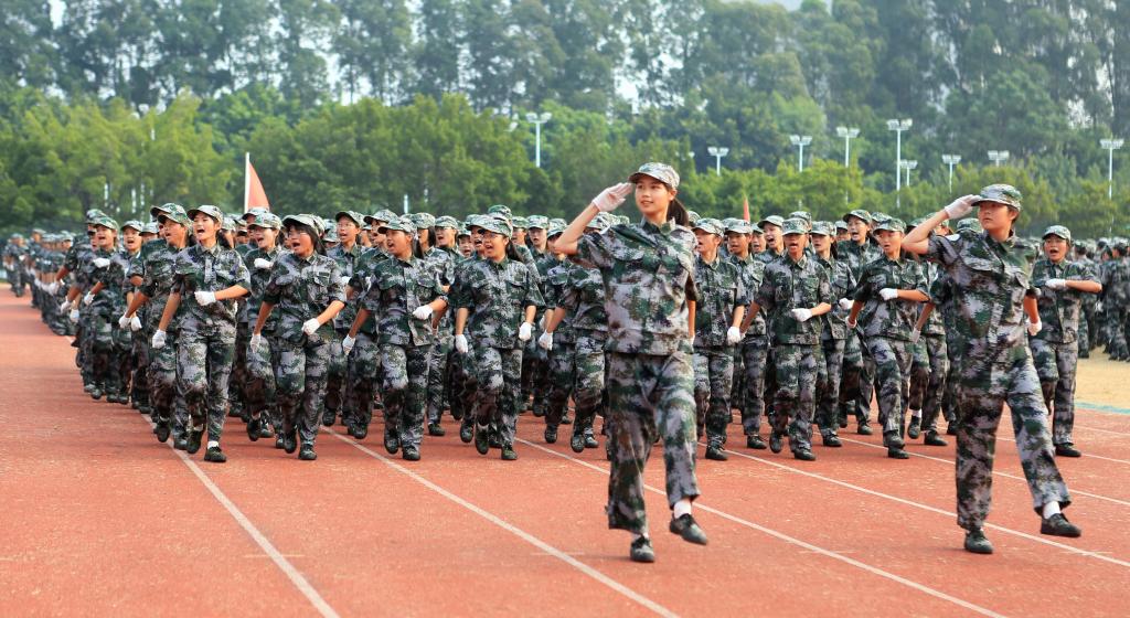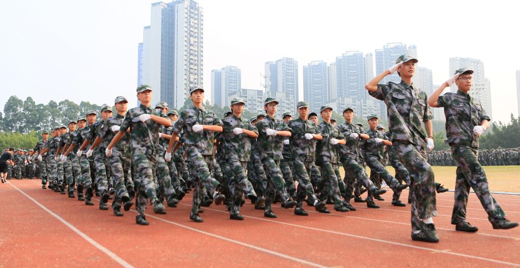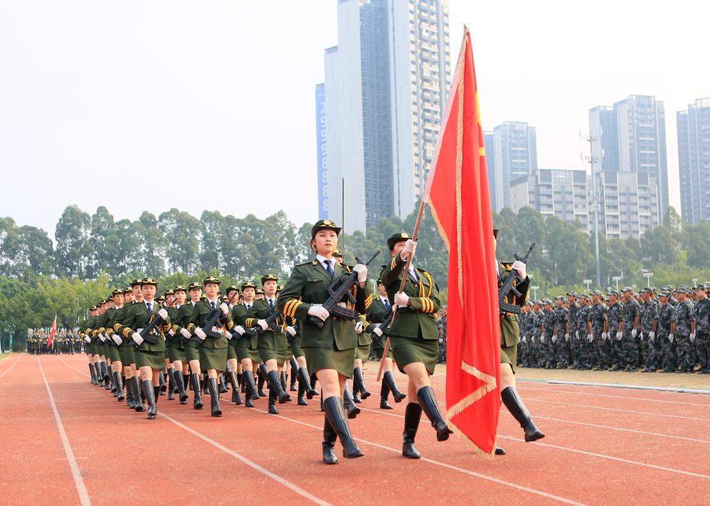 伴随着雄壮的《中国人民解放军军歌》,50名2021级新生国旗护卫队队员迈着铿锵的步伐,护卫中国人民解放军军旗入场。来自10个二级学院的5000余名新生以分列式队形紧随其后,同学们步伐整齐、口号嘹亮,以最昂扬饱满的精神状态接受检阅。