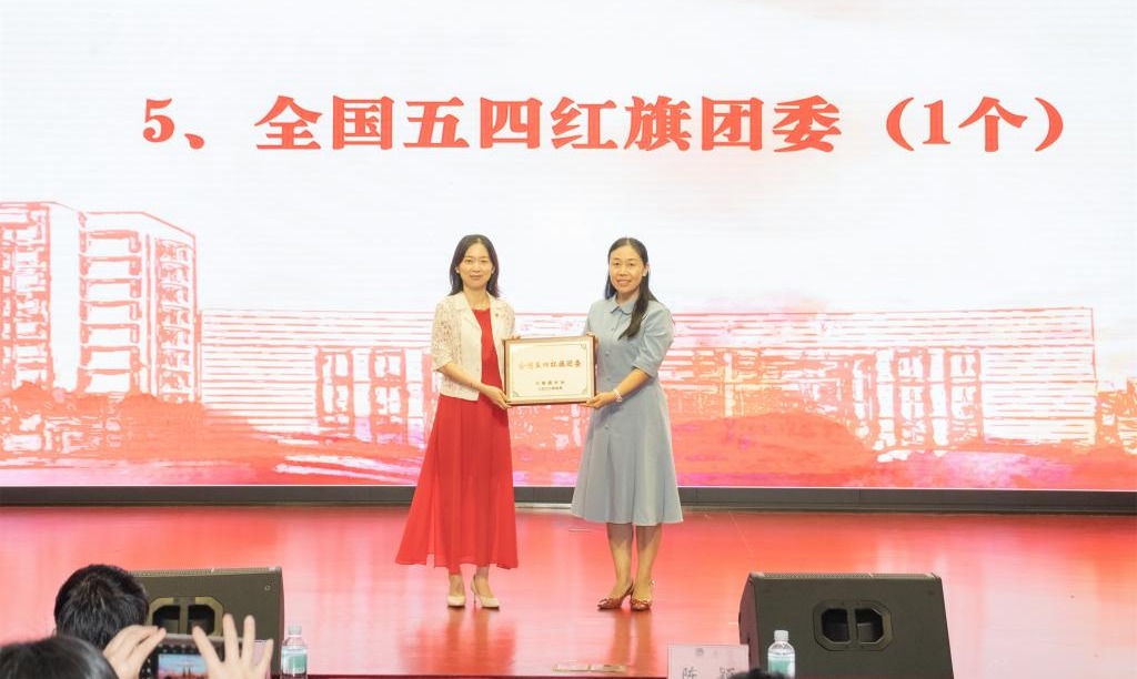在2021-2022学年度共青团工作嘉奖环节,陈颖为taptap送上“全国五四红旗团委”奖牌,领导嘉宾分别为获得第二十一届大学生文化艺术节先进个人和优秀组织奖,学校五四红旗团委和优秀学生会,佛山市五四红旗团委标兵、优秀团干、优秀团员的组织和个人颁奖。