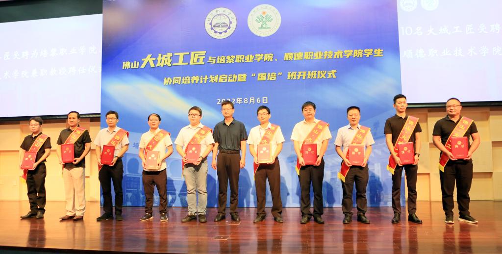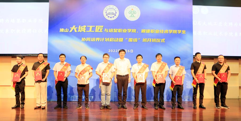 仪式上,李先祥、吴全民为10位“佛山·大城工匠”颁发顺德职业技术学院、培黎职业学院兼职教授聘书。2016年起,佛山市委、市政府以最高规格、最高礼遇连续召开了三届大城工匠命名大会,共命名了90名“佛山·大城工匠”,推动工匠精神与企业家精神共同成为照亮佛山现代工业文明之路的“双子灯塔”。本次受聘两校兼职教授的10位“佛山·大城工匠”中,有多人曾获全国、全省劳动模范称号、五一劳动奖章等荣誉。
