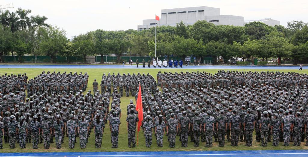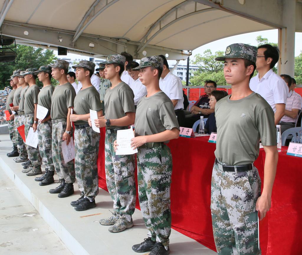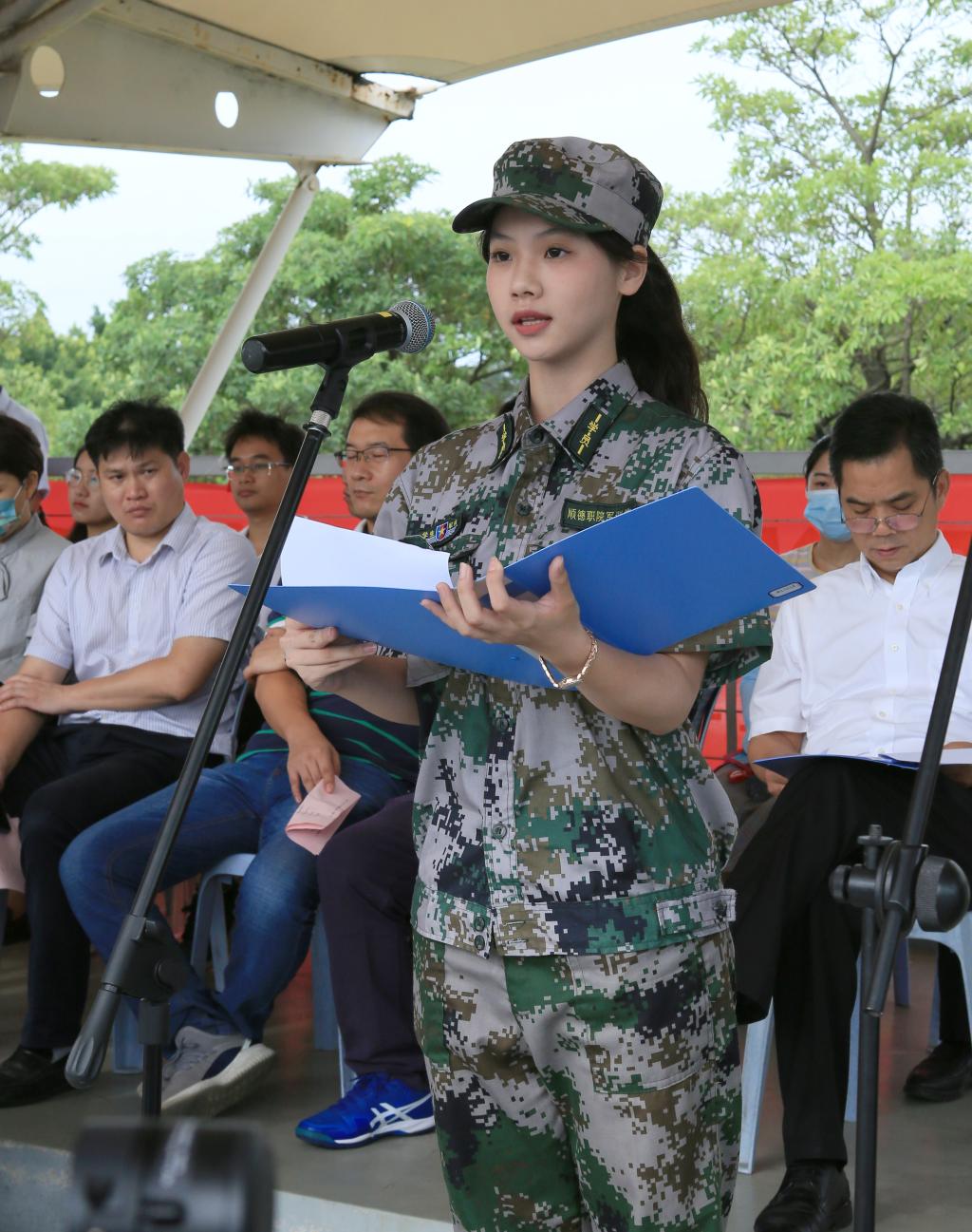 9时许,军训总结大会开始。“迎军旗!”伴随着庄严的《人民解放军进行曲》,护旗手高擎八一军旗,迈着铿锵的步伐进入会场。