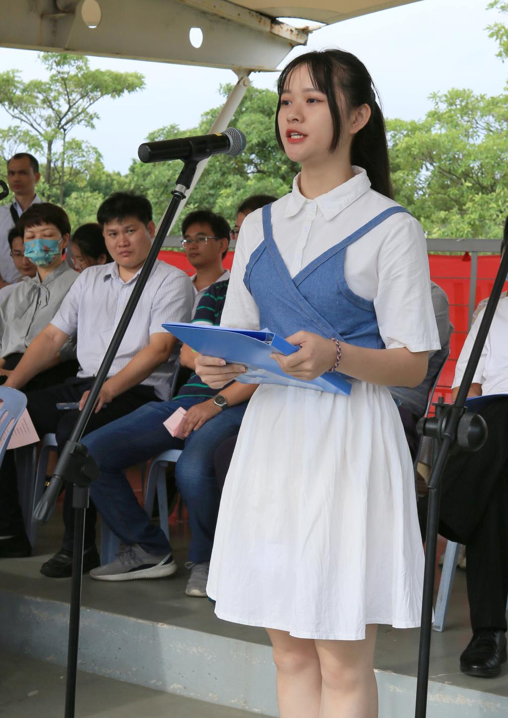 新生代表、酒店与管理学院刘嘉莉同学发言。她表示,将努力学习专业知识,积极参加社会锻炼,开拓视野,提高综合素质,珍惜美好的大学时光,为自己的明天谱写美好诗篇。