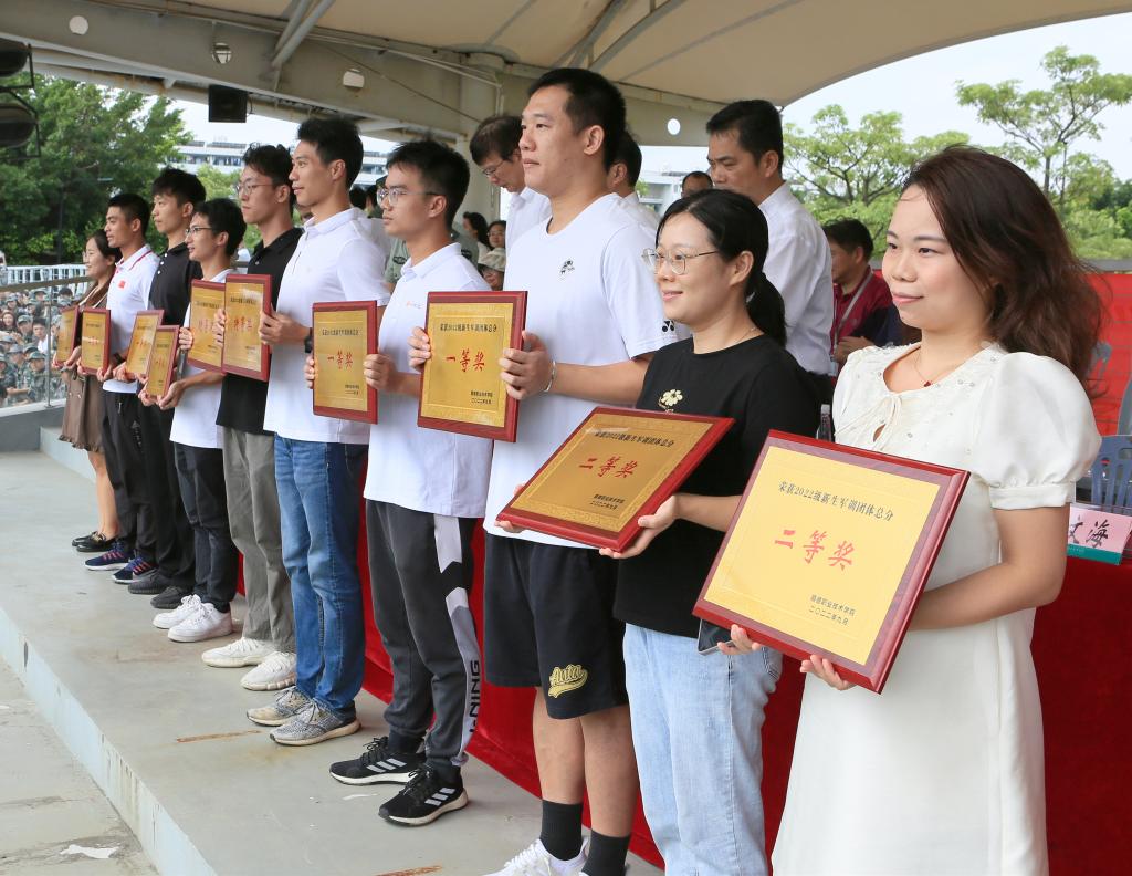 学校党委副书记刘毓宣读《关于表彰2022级新生军训先进集体和个人的决定》。学校领导向优秀教官、军训标兵、优秀军训团体代表颁发证书和奖牌。