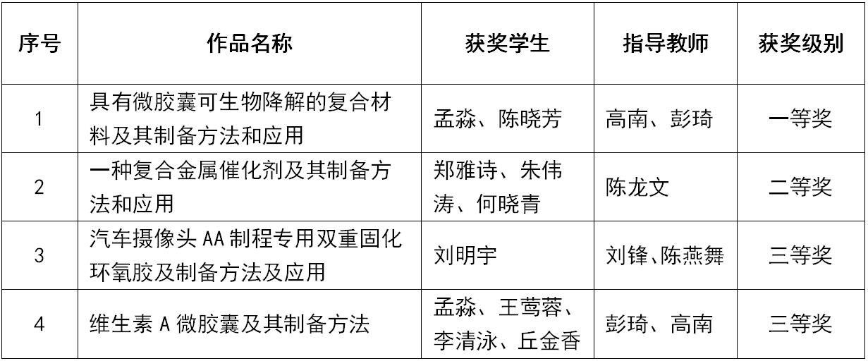 12月27日,第十七届全国高职院校“发明杯”大学生专利创新大赛评委会公示获奖作品名单,轻化与材料学院参赛师生获得专利创新类一等奖1项、二等奖1项、三等奖2项。