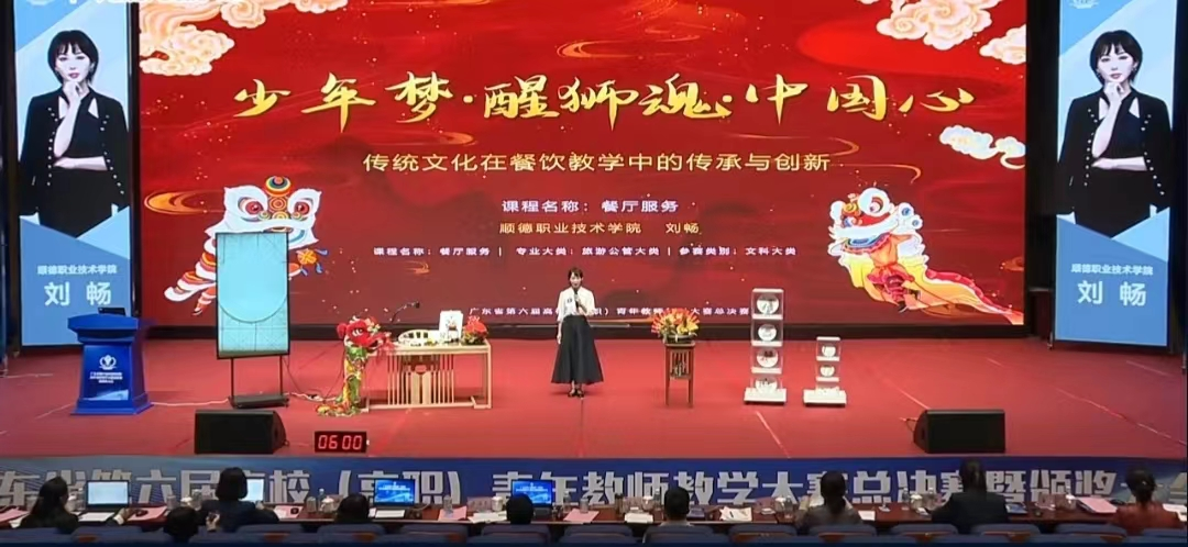 烹饪学院刘畅老师在文科综合大组旅游公管小组取得第一名,登上总决赛舞台。在教学绝活展示环节,她以“少年梦、醒狮魂、中国心”为题,通过融科技、体验、文化于一体的教学策略,让中华传统文化在教学中传承创新,并以佛山醒狮为例,现场展示醒狮果酱画创作与制作;在主题演讲环节,她讲述自己从传媒人转型成为教师,通过孵化餐饮企业、参与国际化平台工作,开展“互联网+”背景下的餐饮产业实践与研究,打造跨专业融合的餐饮服务教学课堂,为学生搭建“兴趣|新人-志趣|职人-乐趣|匠人”的学习成长路径。