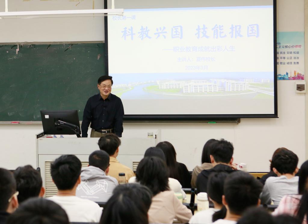 3月9日上午,夏伟在教学楼8栋406教室为2021级建设工程管理班、2021级社会工作2班的学生上“思政第一课”。他以“科教兴国 技能报国——职业教育成就出彩人生”为主题,勉励同学们学习贯彻习近平总书记关于职业教育的重要论述,努力学好知识和本领,以实际行动践行“请党放心,强国有我”的青春誓言。