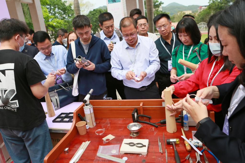 在阳江市海陵岛经济开发试验区平章小学,与会人员参观了美育成果展示工作坊和展板。在“指尖上美育工作坊”“舌尖上美育工作坊”前,taptap师生现场展示珠宝设计与加工、特色美食制作技艺,领导嘉宾们纷纷驻足观看,并饶有兴致地亲手体验。