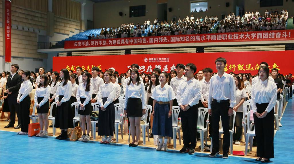 典礼尾声,现场全体起立,合唱校歌《天地之大,任我翱翔》。骊歌声起,青春未央。今日挥手道珍重,明朝昂首笑春风;愿君移向长林间,他日将来作栋梁。衷心祝愿2023届顺职毕业生在拥抱未来的大道上,坚定不移追光前行,向着远方全力奔跑,与伟大时代双向奔赴,唱响更加精彩的青春之歌!