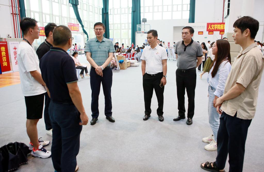 9月8日下午,校领导带队冒雨前往校门口、报到注册点等场所,详细了解新生报到人数、报到流程、车辆进出安排等情况,要求继续强化迎新工作的精准性、细致性,强化各二级学院、职能部门协同工作机制,切实做好强降雨防御工作,落实各项应对措施,为新生顺利报到保驾护航。在报到处,校领导与新生和家长亲切交流,向同学们的到来表示热烈欢迎,勉励大家尽快适应校园生活,做好学业规划,努力提升自我,不负大学好时光。