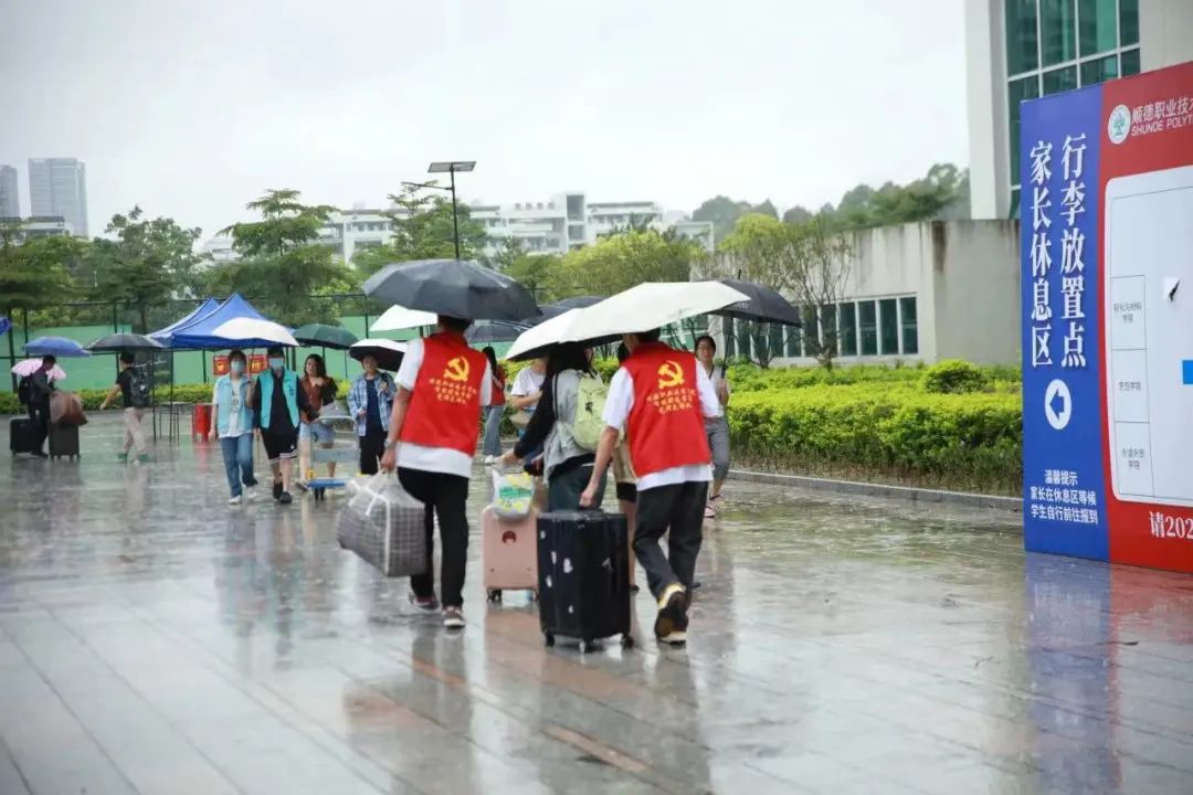 受台风“海葵”残余环流和季风影响,9月8日,顺德出现持续性强降雨。为确保迎新工作安全顺利有序进行,学校高度重视、周密部署,制定工作方案和应急预案,各职能部门、二级学院密切协作,全力克服天气不利因素影响,优化报到流程,为新生提供便捷、高效、周到的保障服务。风雨里,志愿者们往来穿梭,积极维护秩序,协助搬运行李,为新生答疑解惑。