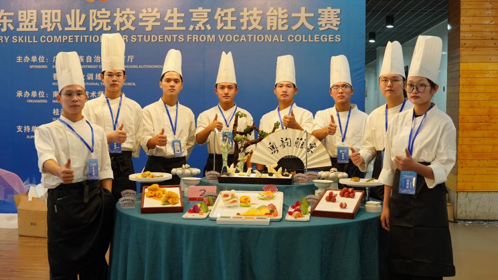 此次大赛特色鲜明,作品要求既具地方特色,又具有东南亚饮食风情,东盟国家参赛队伍数量、大赛办赛规模均为历届之最。烹饪学院相关负责人表示,近年来,烹饪学院高度重视学生技能竞赛工作,构建了国赛、省赛、特色赛事三级竞赛体系,实现学生技能竞赛全覆盖;创新职业技能竞赛指导模式,以国赛指导老师团队为核心,开展新老结对、以老带新的“传帮带”,充分激发师生参赛积极性。同时,学院积极推进“岗课赛证”融通,充分发挥职业技能竞赛“树旗、导航、催化、定标”作用,实现“以赛促教、以赛促学、以赛促建、以赛促改”。接下来,学院将以本次比赛取得佳绩为契机,继续大力弘扬工匠精神,培养更多高素质技术技能人才。