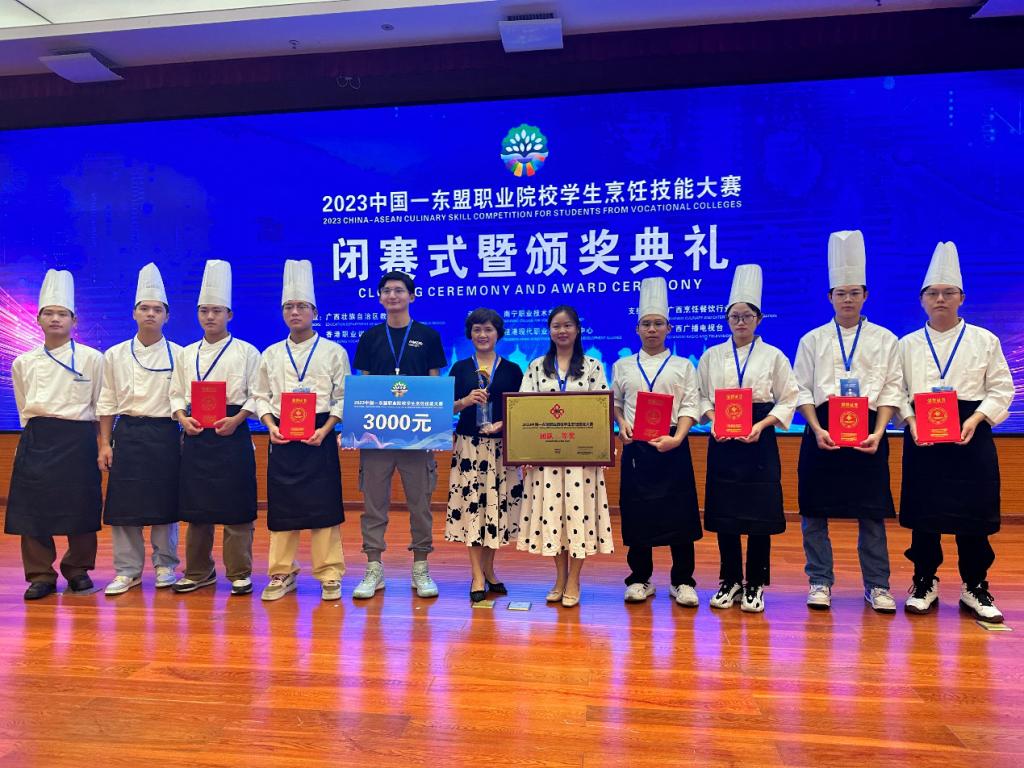 9月14日至16日,2023中国-东盟职业院校学生烹饪技能大赛在南宁举办,来自中国和东盟国家的22所本科和高职院校的110名选手同台竞技。taptap烹饪学院8名学生组成的代表队(指导教师:鲍亦璐、梁婕、谭聪)获得团体二等奖及最佳组织奖,学生在西式烹调赛项中获一等奖1项、二等奖1项,在创新面点赛项中获二等奖1项,在食雕与冷拼赛项中获三等奖2项,在中式烹调赛项中获三等奖1项,潘英学获优秀指导教师称号。