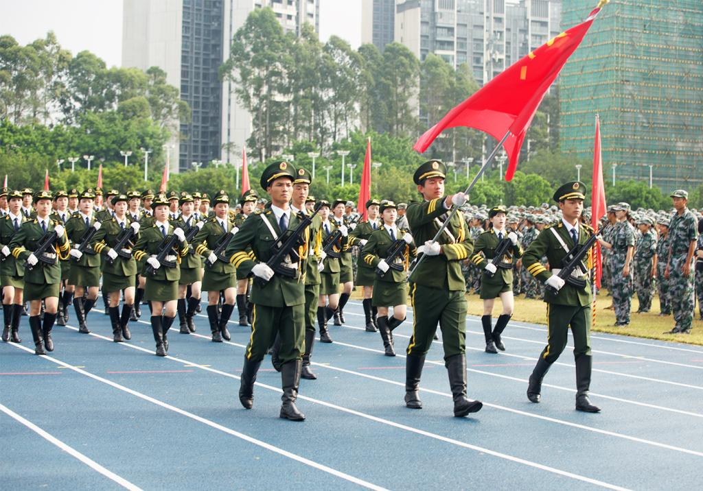9时许,军训总结表彰大会开始。伴随着庄严的《中国人民解放军进行曲》,护旗手高擎八一军旗,迈着铿锵的步伐进入会场。