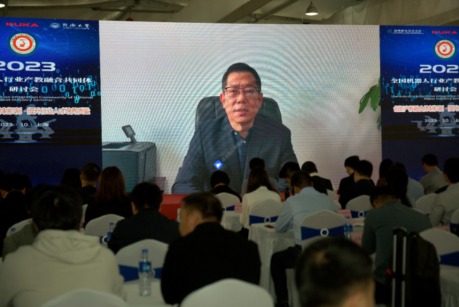 工业和信息化部教育与考试中心主任郝志强、教育部职业教育与成人教育司职业院校发展处处长任占营发表视频致辞,教育部高校毕业生就业协会机器人专委会秘书长张冉冉、库卡机器人(上海)有限公司GI行业总监吕健、同济大学工业4.0学习工厂主任陈明、库卡上海教育行业总监陈宏等出席研讨会。