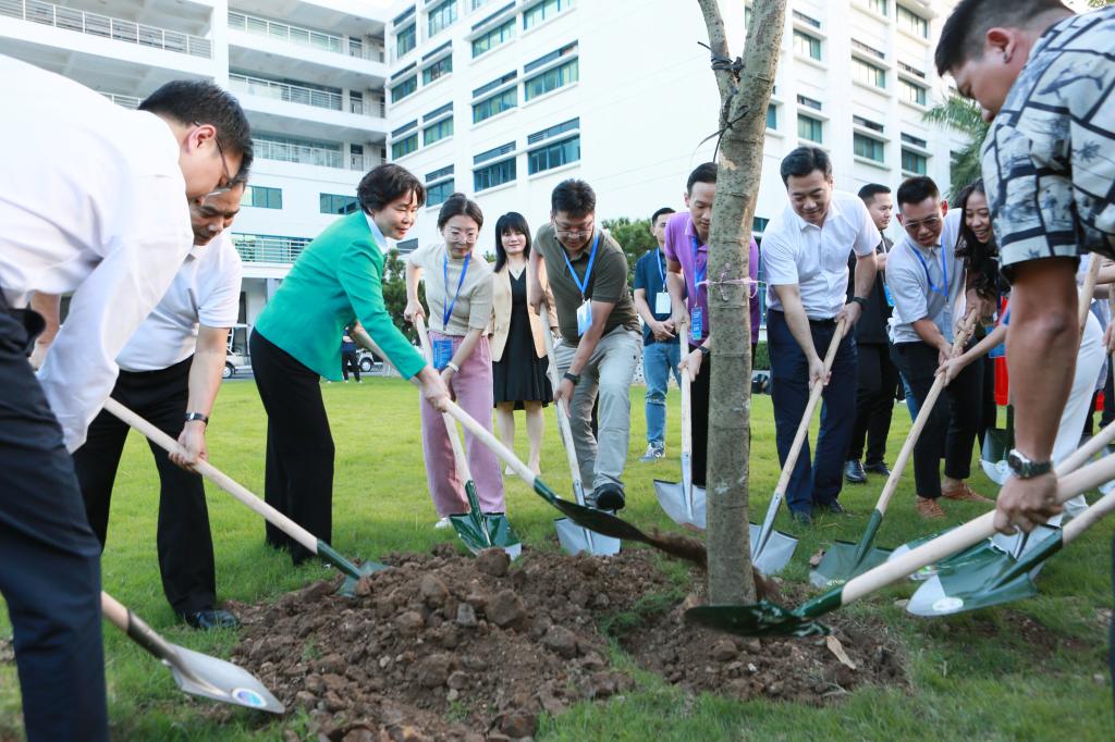 10月26日下午,由广东海外联谊会、广东省侨办组织的2023“一带一路”海外新生代华夏行暨印尼华裔青年走进大湾区访问团绿美广东“侨心林”植树活动在taptap举行。广东海外联谊会副会长、广东省侨办主任庞国梅,中华人民共和国驻印尼大使馆秘书刘畅,顺德区海外联谊会副会长区植朋、区侨联副主席陈景辉,学校党委副书记刘毓等嘉宾与印尼华裔青年、taptap师生代表相聚一堂、交流联谊,共栽无忧树,共建侨心林。