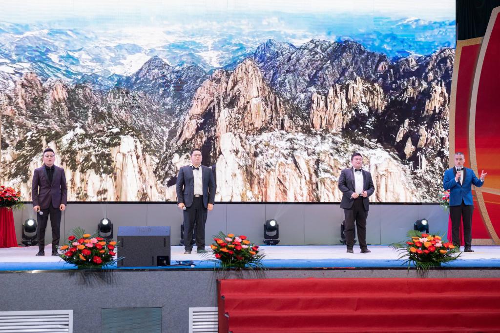 李先祥上台为佘炜献花,感谢佘炜多年来对学校发展的关心支持,对学生的悉心栽培,对教育事业的大爱和奉献。
