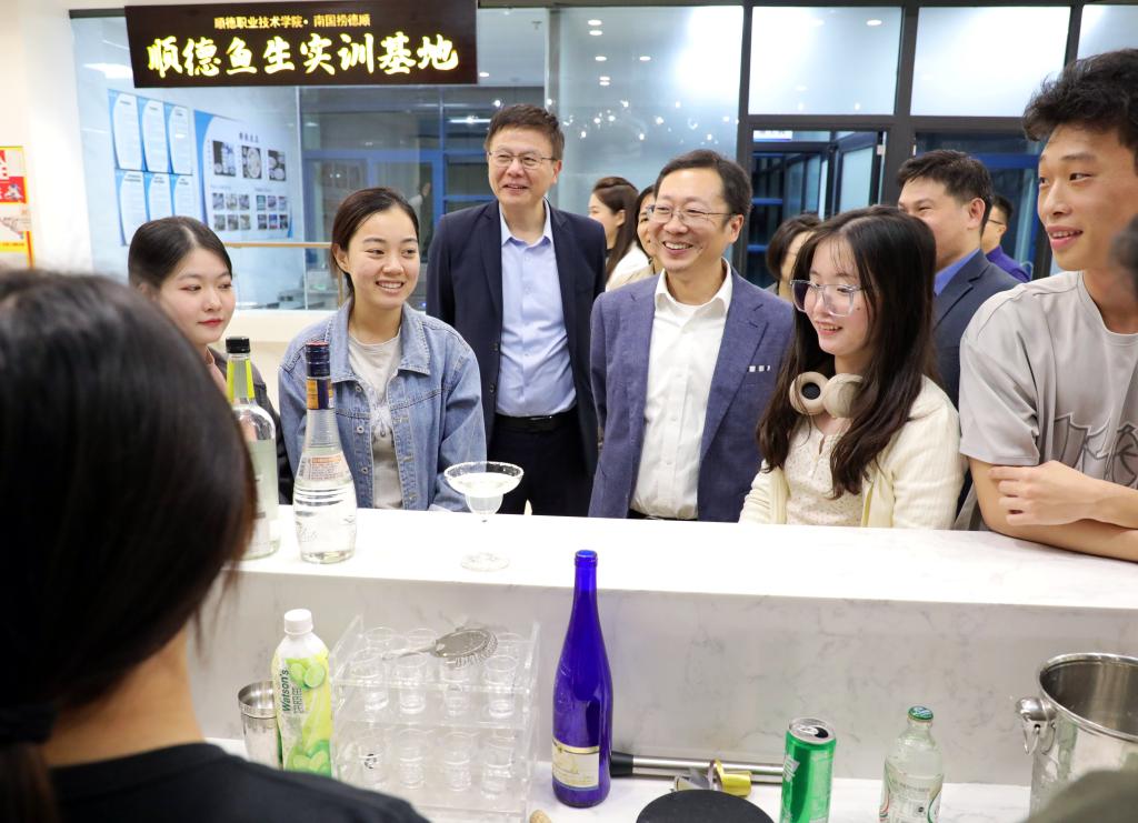 冯伟一行察看了学校沙盘,参观考察了设计学院、广东-亚琛工业4.0应用研究中心、烹饪学院等,与师生亲切交流,听取学校办学情况汇报。冯伟充分肯定taptap建设发展取得的成绩,对有关工作提出指导意见和要求。他强调,要深入学习贯彻习近平总书记关于教育的重要论述精神,牢牢把握高质量发展这个首要任务,落实立德树人根本任务,坚持以教促产、以产助教、产教融合、产学合作,在提升办学层次和关键办学能力上下功夫,在服务人的全面发展、服务经济社会发展、服务国家重大战略上下功夫,努力培养更多高素质技术技能人才、能工巧匠、大国工匠,为建设教育强国贡献力量。