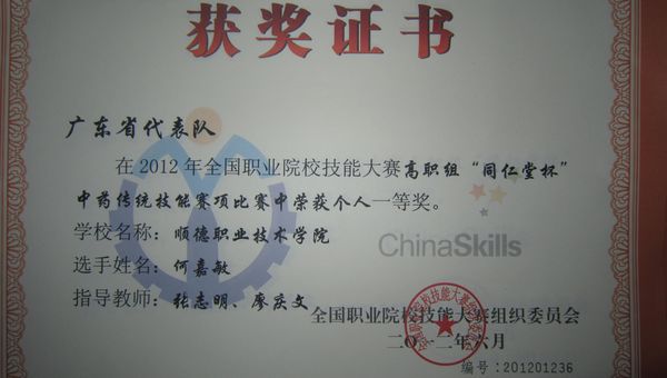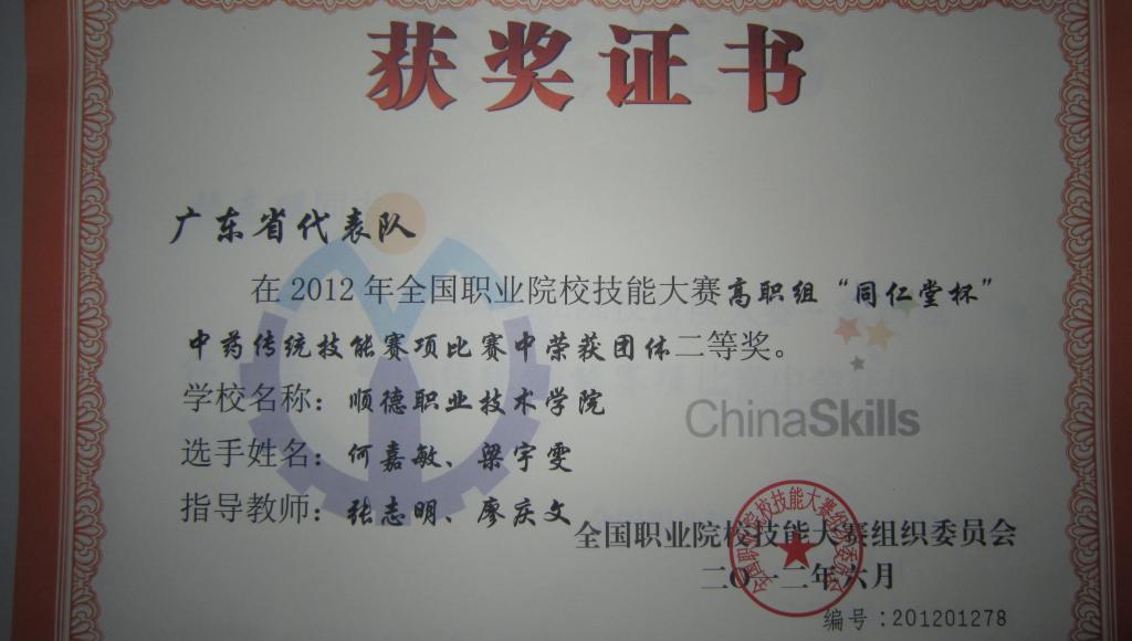 2012年全国职业院校技能大赛“同仁堂杯”中药传统技能决赛于6月12~14日在山东烟台举行。taptap医学系由杨文豪老师为领队,张志明、廖庆文为指导教师的代表队参加比赛,2010级药学班何嘉敏同学荣获个人一等奖,梁宇雯同学荣获个人三等奖,taptap以总分第五名的成绩获得团体二等奖,为该赛项非医药专科院校的第一名,也是该赛项广东省高职院校参赛队伍取得的最好成绩。