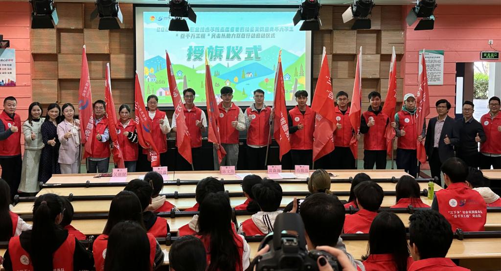 陈文海代表学校对即将擂鼓出征的师生们表示问候并提出希望。他强调,要突出社会实践的思想内涵和价值取向,在深入基层实践中认真学习习近平新时代中国特色社会主义思想,立志做有理想、敢担当、能吃苦、肯奋斗的新时代好青年。要强化责任担当,在锐意进取的躬身实践中展现青春作为。要扣紧时代所需和顺职所能,将助力“百千万工程”与参与“挑战杯”“攀登计划”结合起来,将社会观察、知识积累、实践思考等成果凝固下来,努力推进社会实践成果培育转化,为强国建设、民族复兴挺膺担当。要发挥专业优势,在高质量发展的实践中展现青春风貌。