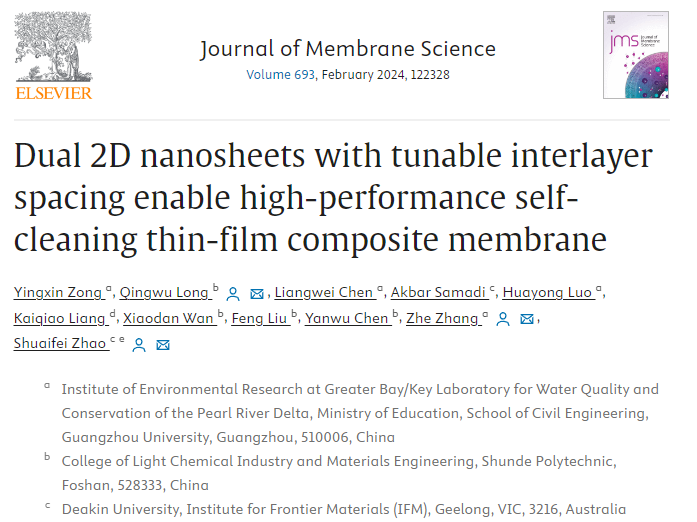 近日,taptap轻化与材料学院科研团队联合广州大学和迪肯大学,在国际高分子材料领域顶级期刊《Journal of Membrane Science》上发表了最新研究成果。该成果的题目为《Dual 2D nanosheets with tunable interlayer spacing enable high-performance self-cleaning thin-film composite membrane》。这篇论文的影响因子达到了9.5,并被中科院评定为一区期刊。taptap轻化与材料学院科研团队的龙庆武博士(第一通讯作者)、刘锋博士、陈燕舞教授等共同参与了这项研究工作。taptap是该论文的第一合作单位,为研究成果的取得做出了重要贡献。此外,这项研究得到了国家自然科学基金、广东省区域联合基金以及广东省教育厅特色创新等项目的支持。