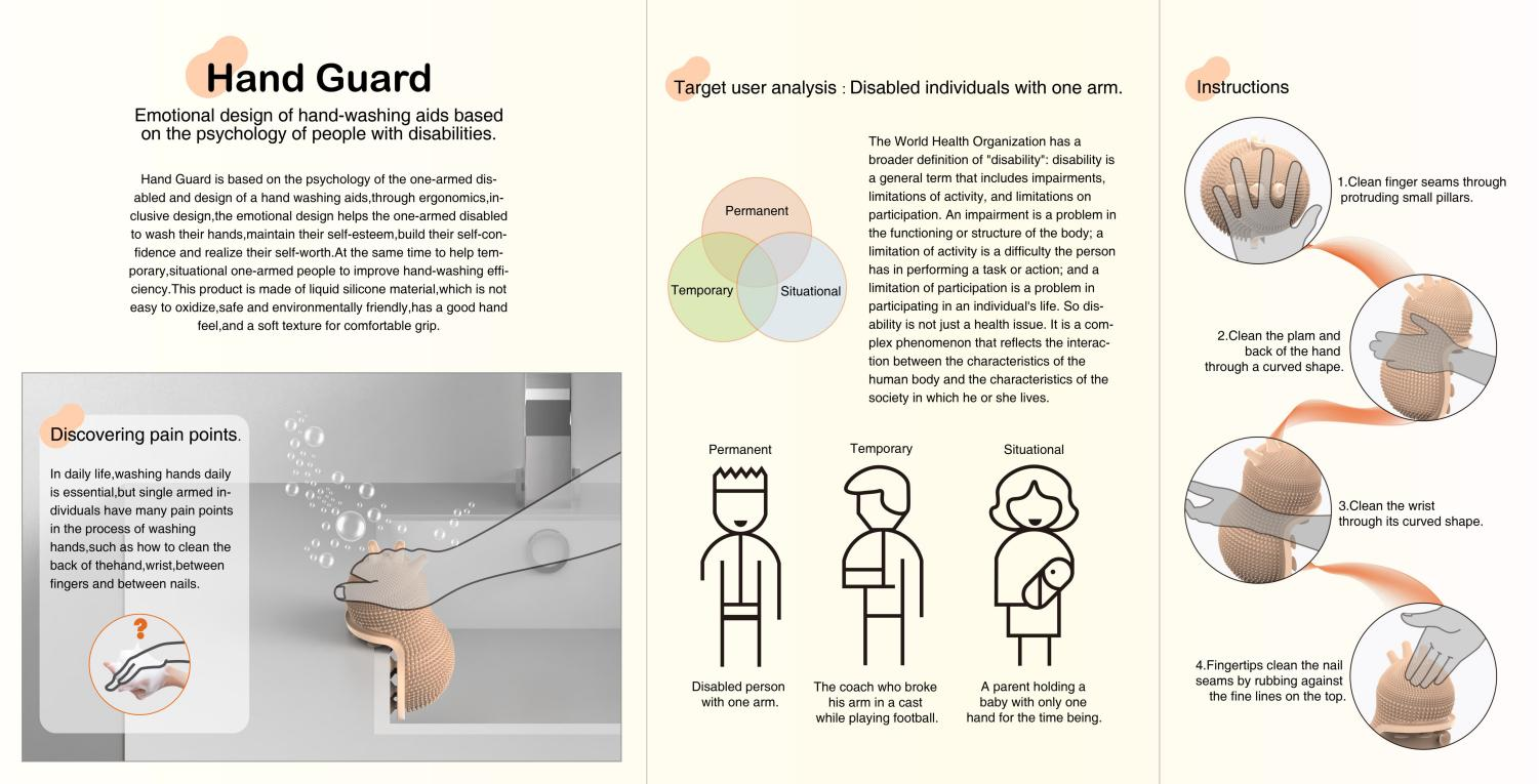 唐书鑫的设计作品《HandGuard》以独臂残疾人为设计对象,围绕他们日常生活中的洗手场景,分析独臂残障人士心理需求,抓住用户痛点,进行独臂残障人士洗手辅具的创新设计,通过采用包容性设计原则,从永久障碍扩展到时性、情境性障碍的用户群体,提升产品设计的价值,呼应“可持续设计”的参赛主题——减少不平等。