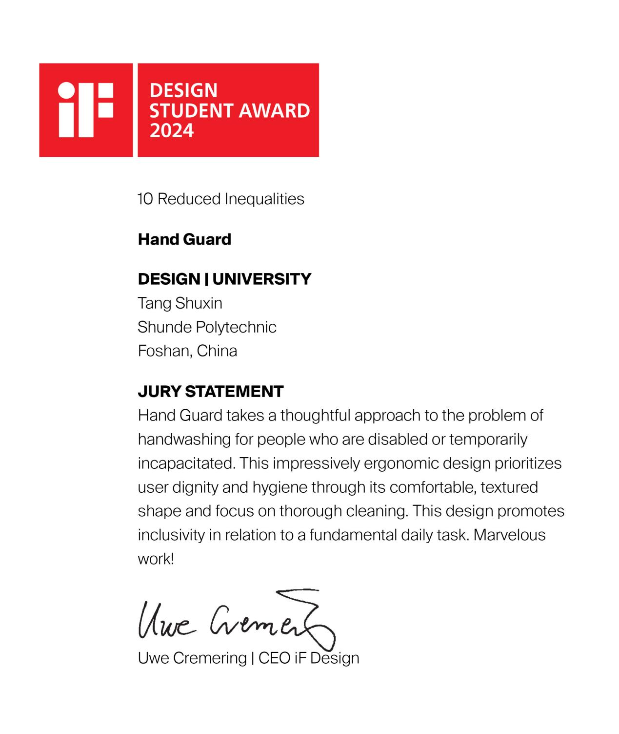 评委会对唐书鑫的作品的评语是:“HandGuard采用了一种深思熟虑的方法来解决残疾或暂时丧失行为能力的人的洗手问题。这种令人印象深刻的人体工程学设计通过其舒适、有质感的形状,专注于彻底清洁,优先考虑用户的尊严和卫生,促进了与日常任务相关的包容性,是一项了不起的设计!”