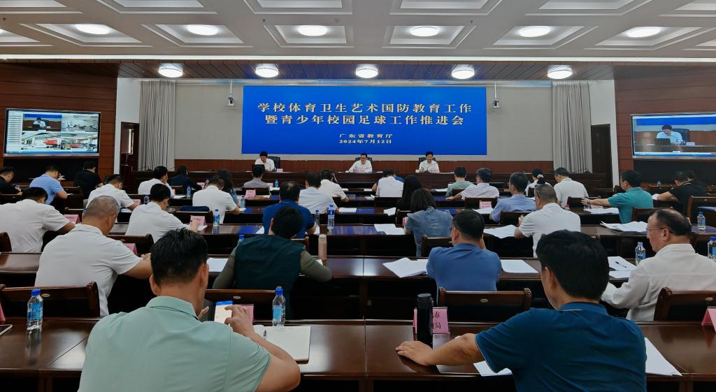 7月12日,广东省学校体育卫生艺术国防教育工作暨青少年校园足球工作推进会召开。广东省教育厅分管领导、相关处室负责同志,省青少年校园足球工作领导小组成员单位有关同志,各地市教育局分管领导、体卫艺处(科)长,省属中小学校分管领导,各高校分管校领导,各校体育、卫生与健康教育、美育、国防教育工作相关部门负责人参加会议。