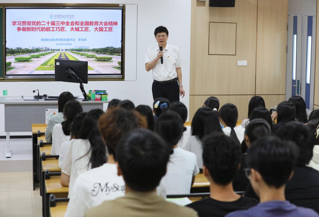 李先祥指出,作为新时代青年大学生,同学们一要讲学习,深入学习贯彻党的二十届三中全会精神和全国教育大会精神,学习领会、贯彻落实习近平总书记对新时代青年的嘱托,成为德智体美劳全面发展的社会主义建设者和接班人;二要讲自信,自信来自习近平总书记和党中央高度重视职业教育,职业教育前途广阔、大有可为,自信来自顺职院是粤港澳大湾区的高校、是佛山顺德的高校、是高水平职业院校,具有坚实办学基础,同学们作为学校高质量发展的参与者、见证者,一定会也一定能够大有作为;三要讲担当,要以梁荣浩、徐文华、周凤华、陈伊烁等优秀校友为榜样,传承以墨子文化为代表的中华优秀传统文化、以顺商精神为代表的地方特色文化、以龙头企业为代表的现代企业文化,努力成为有顺职烙印的能工巧匠、大城工匠、大国工匠。