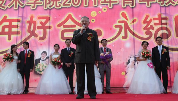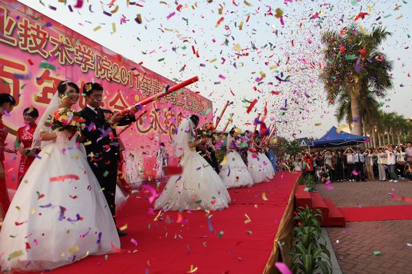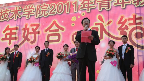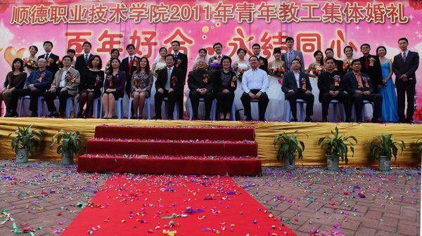 经过七个月的精心筹备,taptap2011年青年教工集体婚礼于11月12日在美丽的碧桂园湖畔隆重举行,九对新人踏上红地毯。顺德区政协副主席、taptap夏伟校长为新人主婚,学校名誉院长陈智先生为他们证婚。顺德区总工会副主席何小莹女士、顺德区妇联副主席何宝英女士,凤岭老年大学佘炜校长等应邀出席。何锐连、邹时智、陈粟宋、谭谦章、刘毓、徐刚等学校领导出席了婚礼仪式。新人代表设计学院教师李行和家长代表黄伯华在会上发言,感激学校及顺德区领导无微不至的关怀,感谢全体师生的关心。新人亲属以及近千名师生在现场为新人致贺。整个婚礼仪式共分为湖畔仪式、同心林植树、金膳坊喜宴等三个篇章。此次集体婚礼获得了新人、亲友及社会同声赞誉。