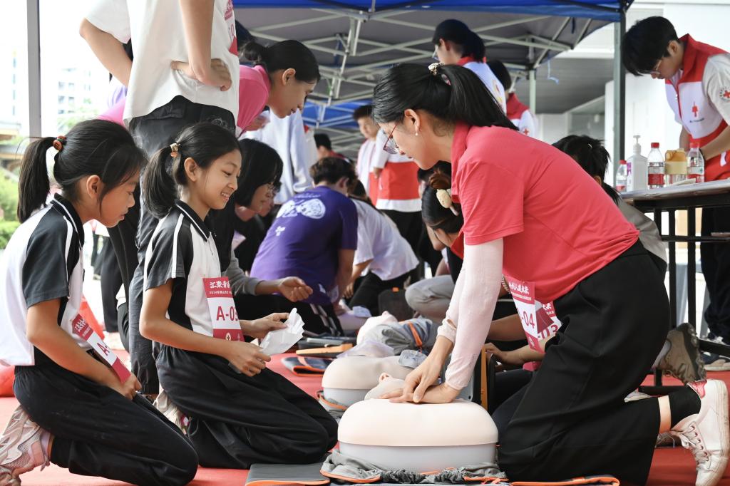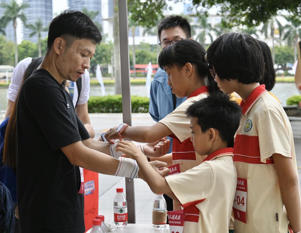 红十字校园公益挑战赛通过徒步方式让青少年在实践中学习掌握应急救护技能,了解“三献”(无偿献血、造血干细胞捐献、人体器官捐献)的重要意义。随着出发号角吹响,选手们迅速投入到比赛中。在心肺复苏、AED操作和气道梗阻处置打卡点,他们展现出专业的急救技能和冷静的判断力,每一个动作都力求精准;在前臂外伤包扎打卡点,他们手法娴熟、配合默契,迅速完成包扎任务;在红十字及“三献”知识答题打卡点,他们凭借扎实的理论基础和快速的应变能力,准确回答问题;在创意拼图游戏打卡点,他们将拼图碎片拼接在一起,形成一幅幅红十字标志。