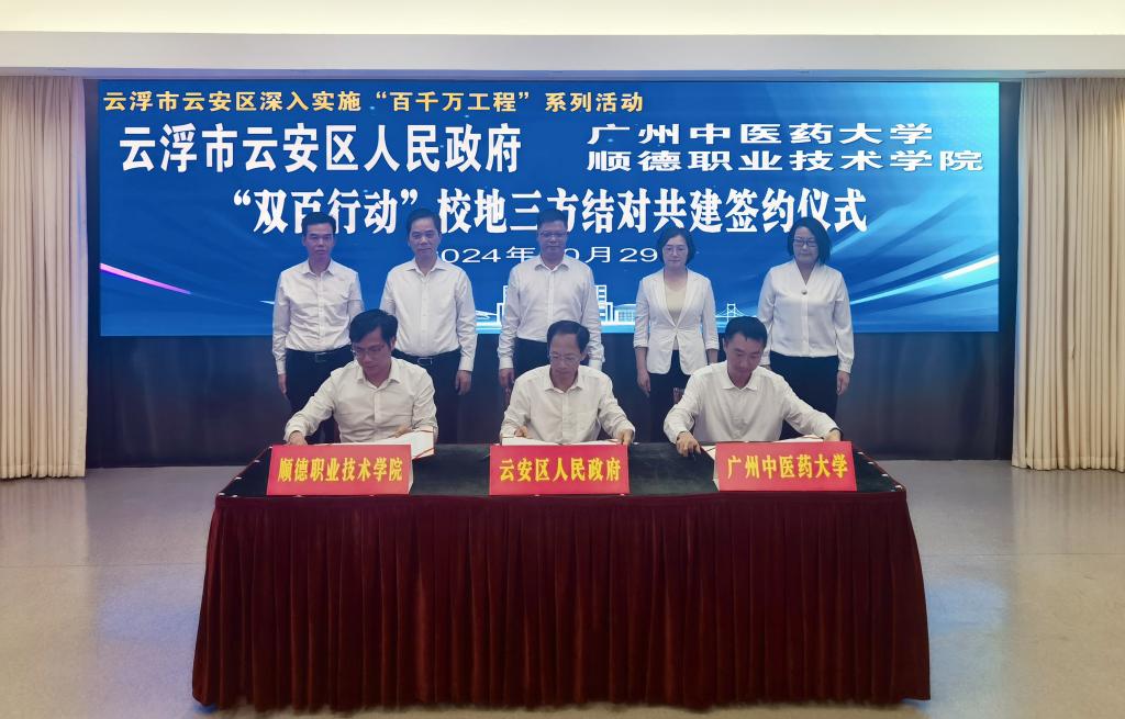 10月29日,广州中医药大学、顺德职业技术学院、云浮市云安区人民政府“双百行动”校地三方结对共建签约仪式在云安区会议中心举行,深入学习贯彻党的二十届三中全会精神和习近平总书记视察广东重要讲话、重要指示精神,落实省委、省政府工作部署,进一步深化校地合作,推动“双百行动”走深走实,为加力提速推进“百千万工程”注入新活力、新动能。
