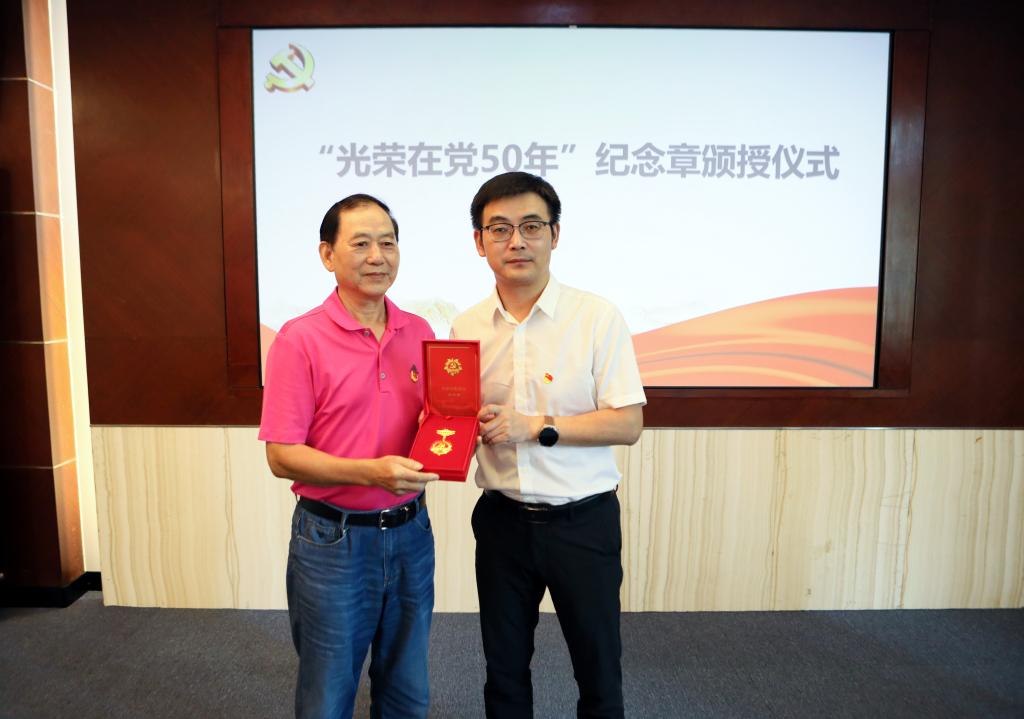 会上宣读了《关于表彰2024—2025学年度“创先争优”活动先进基层党组织、优秀共产党员和优秀党务工作者的决定》以及新增“光荣在党50年”纪念章获得者的情况。在热烈的掌声中,学校党委书记卢清华为退休党总支党员黄元生同志颁发“光荣在党50年”纪念章。