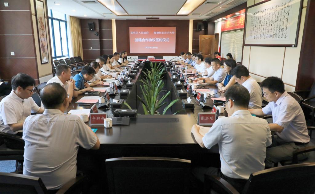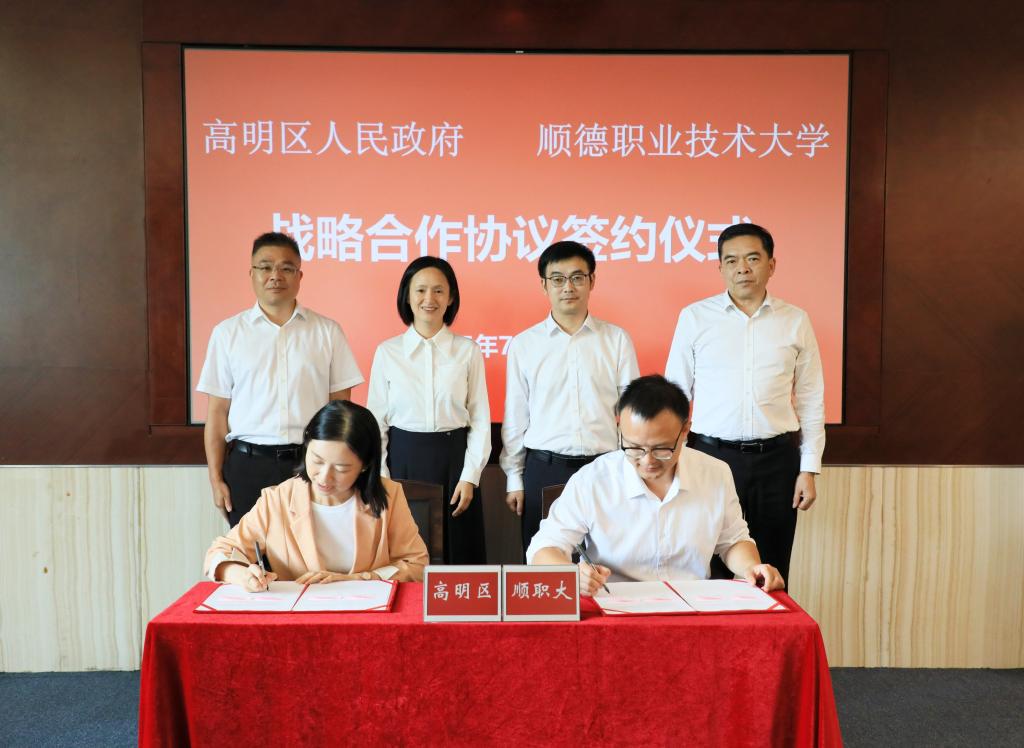 在热烈的掌声中,校地双方签署战略合作框架协议。根据协议,双方将在党建共建、“双百行动”、人才培育、科研创新、文旅融合等领域开展全面合作,构建全方位、多层次、宽领域的合作体系,为高明区高质量发展提供有力支撑,实现高明区经济社会发展与顺职大关键办学能力的协同提升。