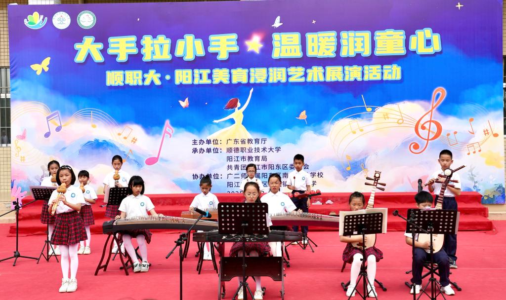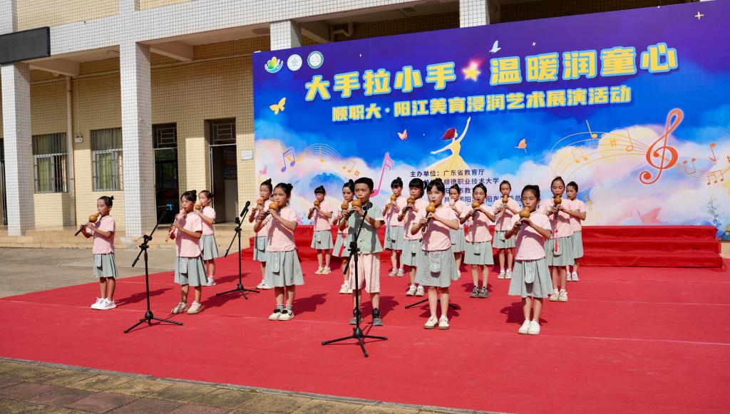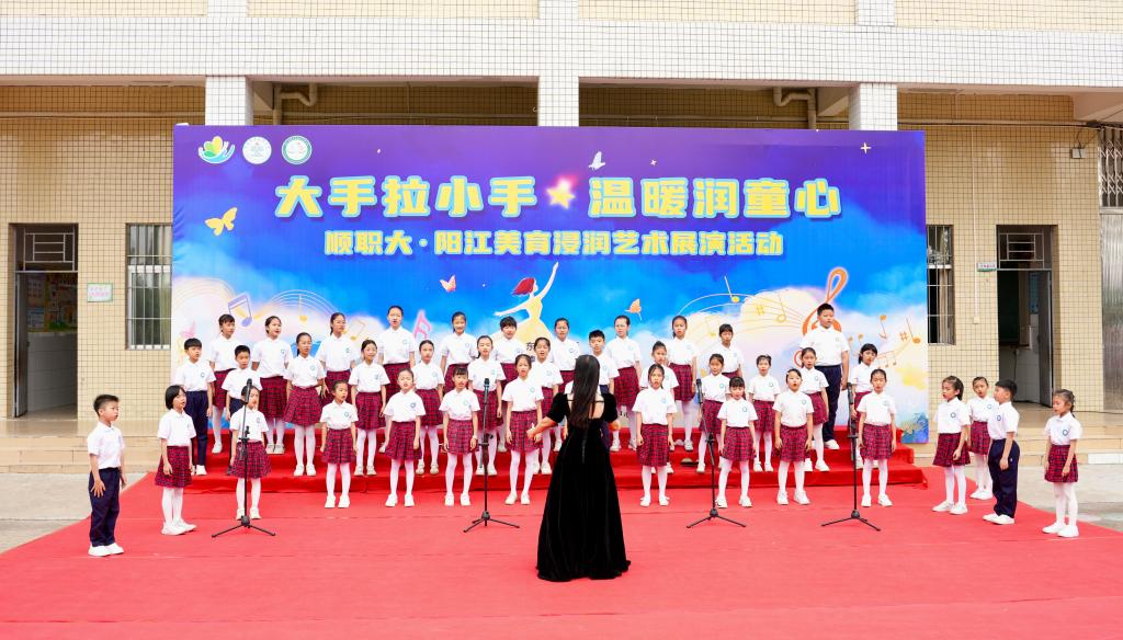 当天上午,“大手拉小手 温暖润童心”顺职大·阳江美育浸润艺术展演活动在阳江市阳东区雅韶镇中心小学举行。展演节目精彩纷呈、类型丰富,涵盖合唱、器乐、舞蹈等多种形式。合唱《甜甜圈》《同一首歌》清甜开场,笛子独奏《扬鞭催马运粮忙》节奏明快,师生合唱《人间》温情动人。舞蹈《遥望暮鼓槌花的少年》舞姿灵动,演绎少年意气,葫芦丝合奏《粉刷匠》《小夜曲》《青花瓷》兼具童趣与雅致,琵琶合奏《划小船》婉转悠扬。男声独唱《气势如虹》高亢激昂,民乐合奏《彩云追月》旋律优美。展演中,孩子们用灵动的舞姿、悠扬的歌声、真挚的情感传递对美的追求与理解,生动诠释了“大手拉小手”校地协同帮扶的丰硕成果,赢得现场观众阵阵掌声。活动中间穿插音乐知识问答环节,并举行了文体用品捐赠仪式。