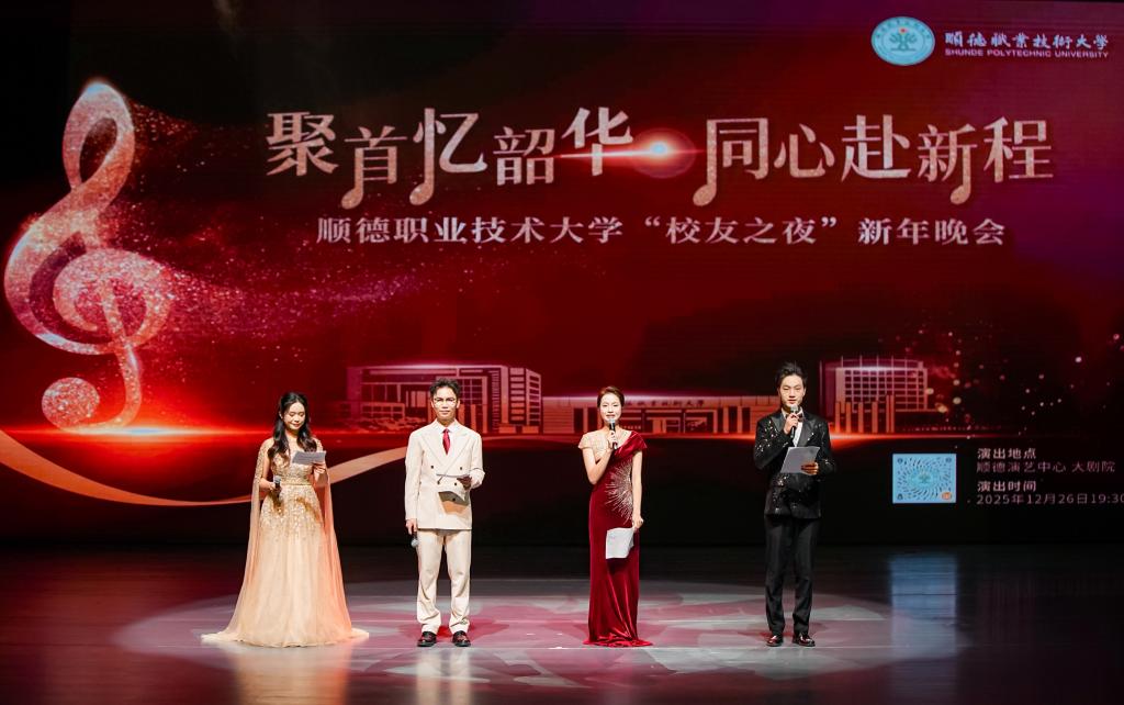 硕果盈枝辞旧岁,欢歌笑语迎新年。12月26日晚,taptap点点官方网站“校友之夜”新年晚会在顺德演艺中心大剧院举行,学校首届校友文化节系列活动圆满收官。整场晚会以“聚首忆韶华 同心赴新程”为主题,以青春旋律与时代精神交织为主线,分为“青春之火”“薪火相传”“筑梦未来”3个篇章,通过17个精彩的歌舞、器乐节目,展现顺职人薪火相传、砥砺奋进的蓬勃朝气,谱写校友与母校同频共振、携手同行的华彩乐章。