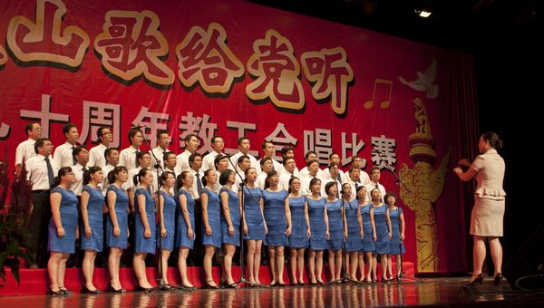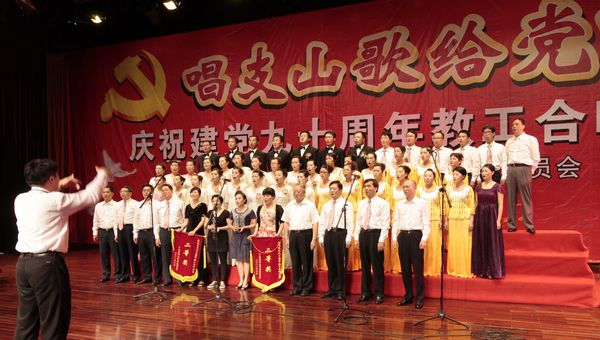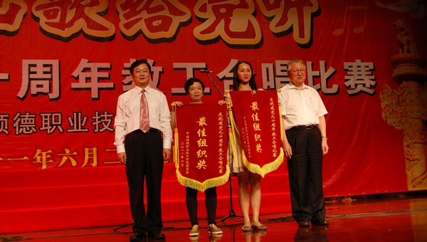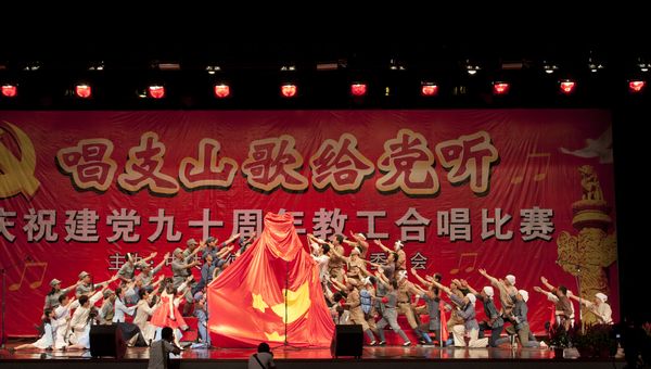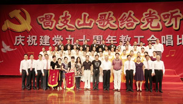 “九十年的发展历程是一座伟大的丰碑, 把无数奋斗者的名字和事迹镌刻;九十载光辉生涯是用热血和生命组成的一串串音符,在天地间唱响荡气回肠的颂歌!让时代的旋律把开拓者的事业永远传承。看我们的队伍在鲜艳的党旗下挽起高山大河!”——在激昂的乐曲声中,主持人高声朗诵着铿锵有力的诗篇,拉开了顺德职院“南粤党旗红——庆祝建党九十周年教工合唱晚会”的序幕。