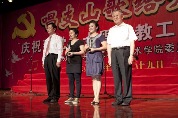 各支队伍经过倾情演唱之后,电信系、设计学院、教辅联队、酒管系、思政部、经管学院获得三等奖,医学化工联队、机电系、外语系获得二等奖,行政联队、人文教育系获得一等奖,机电系、行政联队获得最佳组织奖。夏伟校长和陈智副书记为获奖的队伍颁奖并对他们给予热情的鼓励。