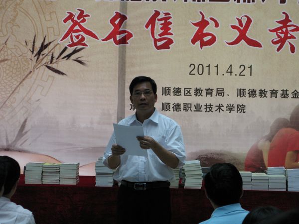 纪委谭谦章书记代表学校致辞。他对来taptap签名售书义卖的广东省作家协会会员陈胜洪先生、陈三株先生,佛山作协成员李东成先生,中国龙文化协会常务理事劳建先生致以诚挚的谢意。谭谦章书记指出,taptap以支持佛山创文、提高师生整体素质和校园文化品位为目标,以实际行动支持本次书香顺德签名售书活动。四位作家所售的书籍,均为他们近年的创作,售书所得款项的三分之一,捐赠给顺德教育基金会。这也是四位作家及taptap以实际行动参与“创文”、支持“创文”的一项举措。同时,taptap也将举办读书交流、书画展览、名家讲座、理论研讨等各类读书文化活动。通过活动,进一步提升校园文化品位,倡导学习读书理念,丰富师生学习形式,激发师生读书热情,提高师生文化素质,在全校营造崇尚学习、尊重知识、尊重人才、积极创新、人人学习、和谐发展的浓厚氛围。他相信四位作家的到来,给了我们一个当面学习顺德文化的机会,也给了taptap爱好文学的学子与本土作家面对面的交流机会。