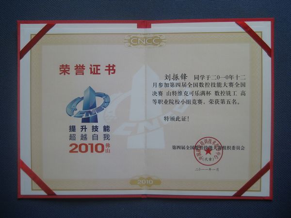 另悉,2010年7月,广东省职业技能大赛和第五届“省长杯”工业设计大赛,taptap机电工程系组队代表学校参赛并获得 “数控铣学生组”、 “数控车学生组”、 “五轴加工师生混合组”三个高职类项目中第一的优异成绩。在9月广东省职业技能大赛数控工种决赛中,刘振锋同学以第一名的成绩脱颖而出,代表广东省参加全国总决赛。