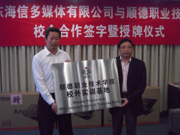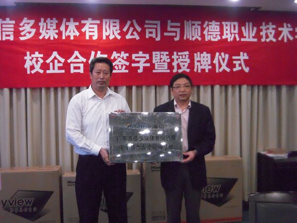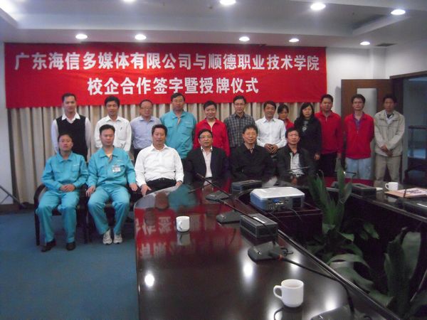 陈粟宋副院长代表taptap与广东海信多媒体有限公司签订了校企合作协议,双方先后授予对方“顺德职业技术学院校外实训基地”和“广东海信多媒体有限公司电子技术人才培养基地”牌匾,会议在坦诚、友好、热烈的氛围中结束。