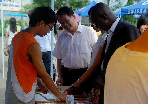 展会现场,很多同学和老师都过来参观和购买一些适合的商品,并观看现场的一些活动,24日下午,何锐连副院长带马里非洲团结正义党代表团外宾参观校园,巧遇会展现场活动,他们饶有兴趣的去现场参观指导,外国客人还高兴地购买了一些小商品,并对活动给予了高度评价。