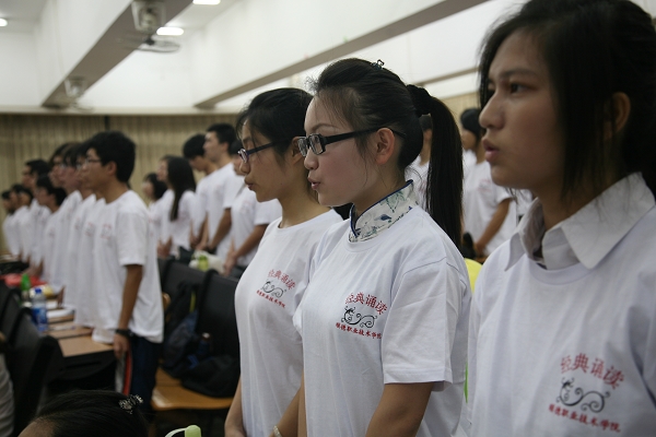 在比赛开始前,经典诵读班的同学们带来的齐诵,或慷慨激昂,或低沉迂回,或亲切明快,人人都情绪饱满,全心投入,赢得场下观众一阵阵热烈的掌声。长期以来,经典诵读班指导老师訾文良一直坚持每周至少两个早上的时间为学生们进行日常训练,在师生共同不懈的努力下,同学们的诵读水平取得长足的进步。