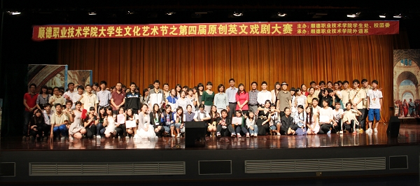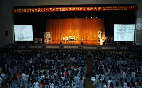 6月2日晚,顺德职业技术学院第十届大学生文化艺术节之第四届原创英文戏剧大赛在梁球琚礼堂火热上演。学院团委副书记张业华老师,外语系主任宁顺青老师,外语系党总支书记陈春艳老师,外语系副主任杨爱国老师等领导出席了本次比赛,全校师生2000多人观看了比赛,而评委团则由外语系对戏剧有深入了解的老师们组成。