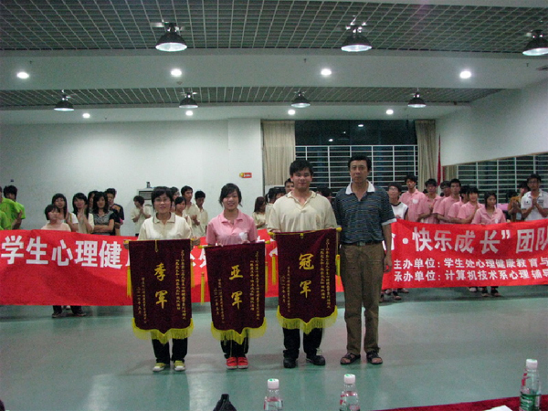 为了迎接2010年“5 25”全国大学生心理健康节,进一步推进我院大学生心理健康教育工作的深入开展,在全院学生中营造一种关注心理健康、懂得心理健康、重视心理健康的氛围,特意举办了本次大学生心理团队活动。本次活动分四个环节,分别是“独具一格”、“闭眼听声”、“与你同行”、“花式足球”。各系参赛队伍在活动中发挥团结协作的精神,展开了积极的比拼。现场气氛热烈紧张,不断响起同学们的呐喊声、助威声。经过激烈的对决,计算机技术系获得冠军;医学系获得亚军;电子工程系获得季军,人文教育系获得最佳组织奖。最后,张荣进书记对本次活动进行点评,肯定了各参赛队伍的表现。